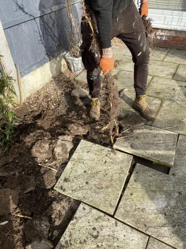 他们用一台挖掘机把Isobel院子里的竹子连根挖出,由于竹子的一些枝干也嵌在下面,工作人员不得不把把院子里的砖块也挖开,将它们彻底清理干净。