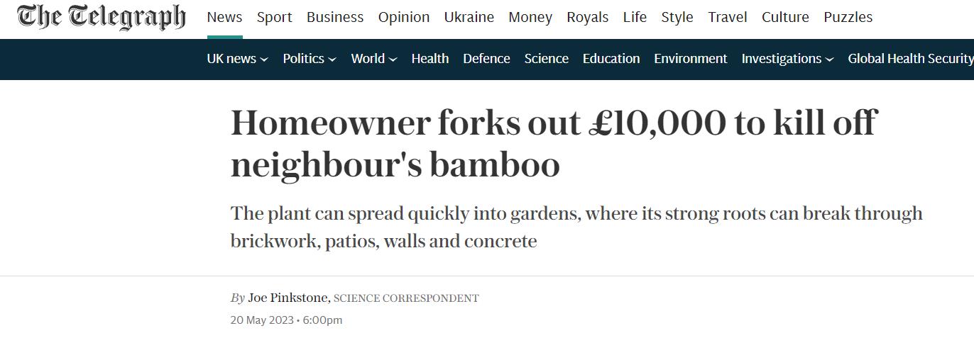 汉普郡(Hampshire)此前就有一位房主,因为邻居家的竹子蔓延到了自己家,房产面临着10万英镑的损失,邻里之间的关系也因为这次意外事件变得恶劣。