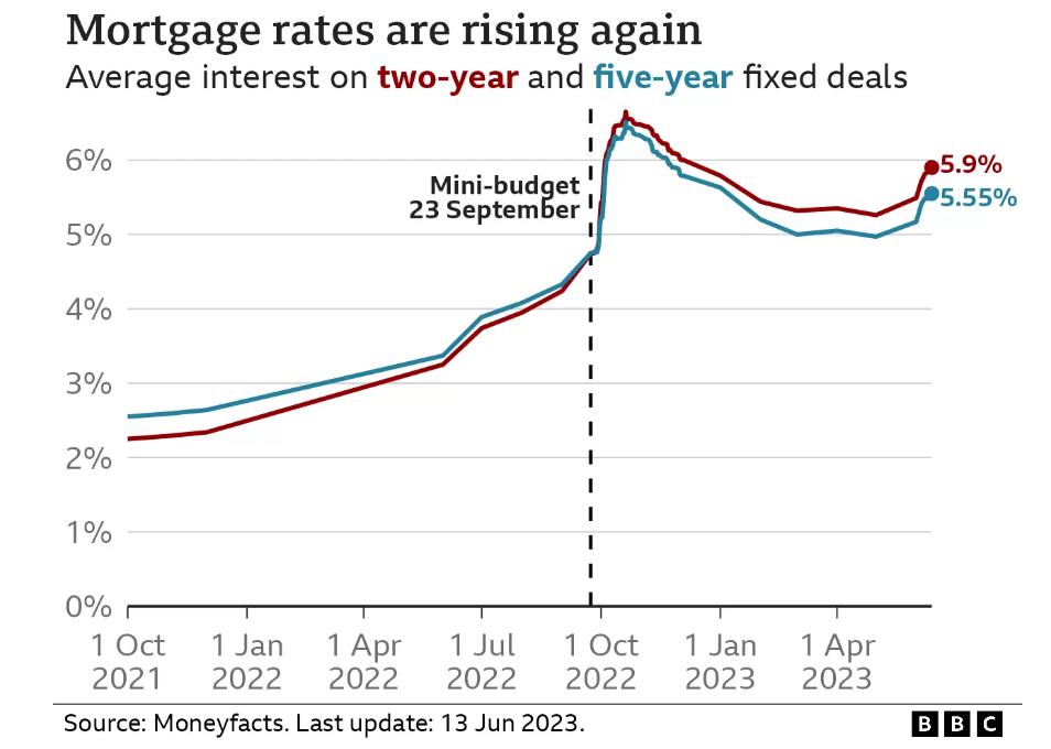 此外,据Moneyfacts的数据,近期抵押贷款的平均利率有所回升。截至6月13日,两年期固定利率抵押贷款的平均利率为5.9%,而五年期固定利率抵押贷款的平均利率为5.55%。