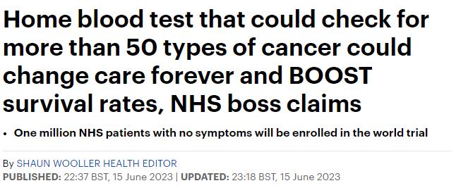 英国卫生部门近日宣布,从明年开始,NHS将向100万人推广一项可以在早期阶段发现50种癌症的家庭血液检测。