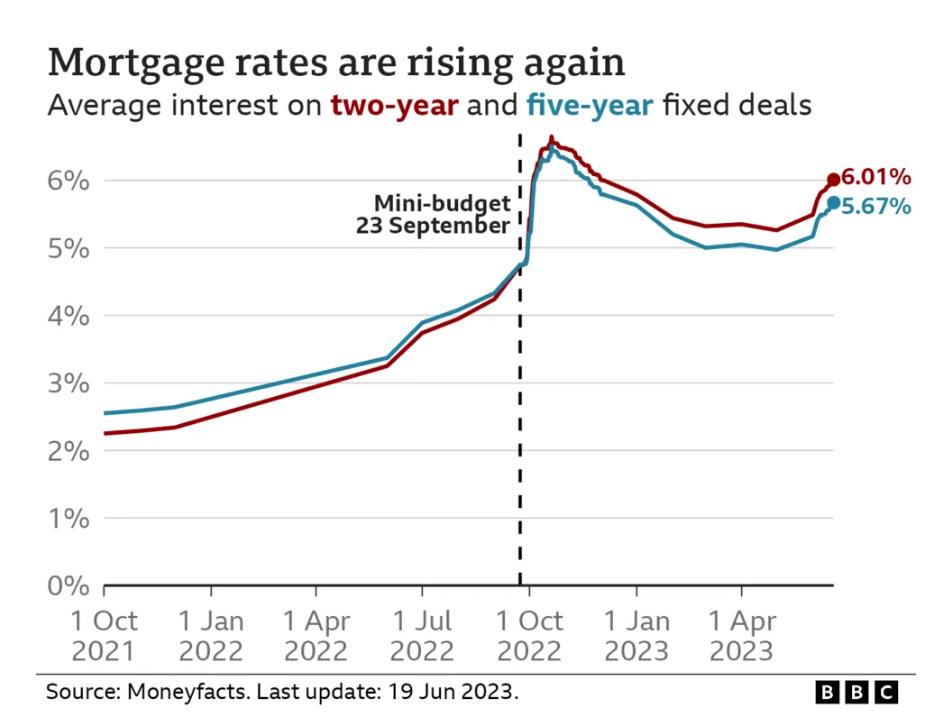 - 英国抵押贷款利率再次上升,两年期固定利率抵押贷款的平均利率自去年12月以来首次超过6%…