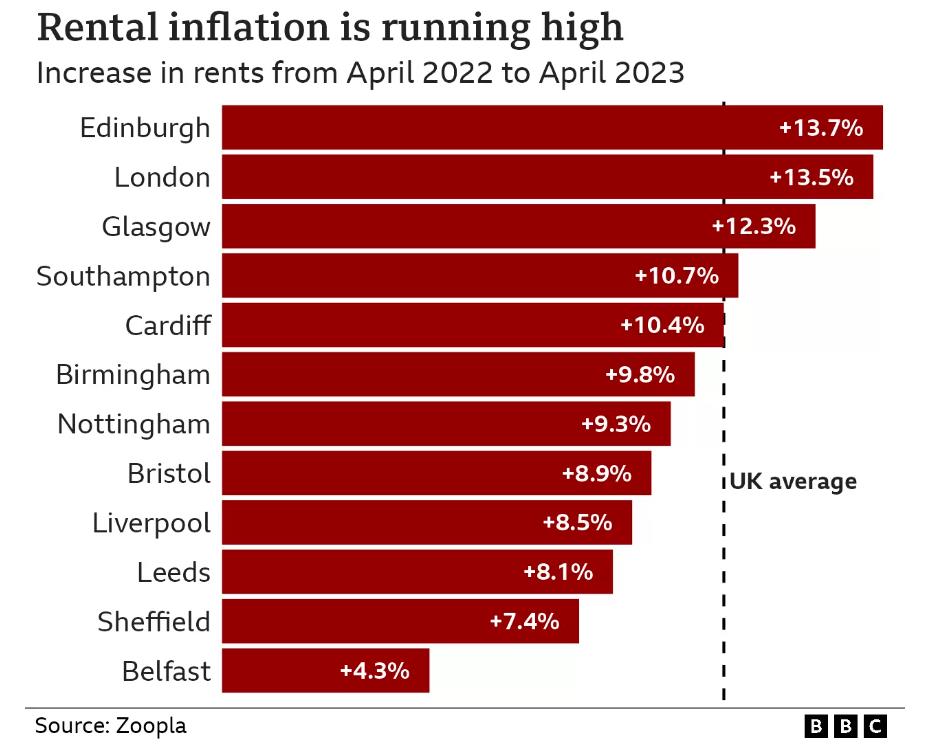 尤其是各大城市,租金涨幅更甚。4月份,伦敦租金同比上涨13.5%,爱丁堡上涨13.7%,格拉斯哥上涨12.3%。