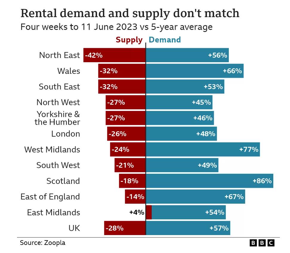 Zoopla表示,由于房东要转嫁抵押贷款利率上升的成本,再加上租赁市场的供不应求,这共同推高了租金。尤其是现在的租赁市场,非常供不应求。