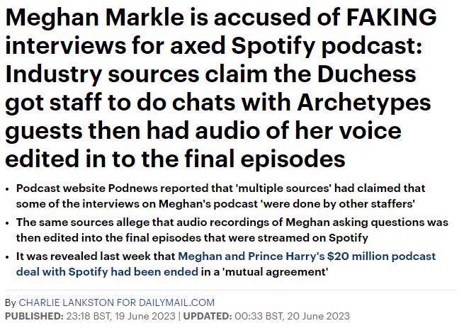 - 梅根被指控在其播客Archetypes中伪造采访,采访实际由工作人员完成,再通过技术转换成梅根的声音…