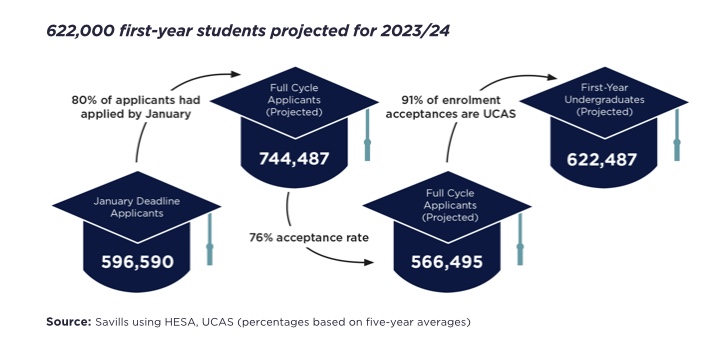 对 UCAS 申请和录取数据的分析表明:这种新入学人数预计将持续下去,2022/23 学年有 618,000 人入学,2023/24 学年将有 622,000 人入学。