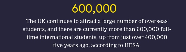 根据 HESA 的数据,目前,英国全日制国际学生超过 60 万人,而五年前仅为 40 万人多。