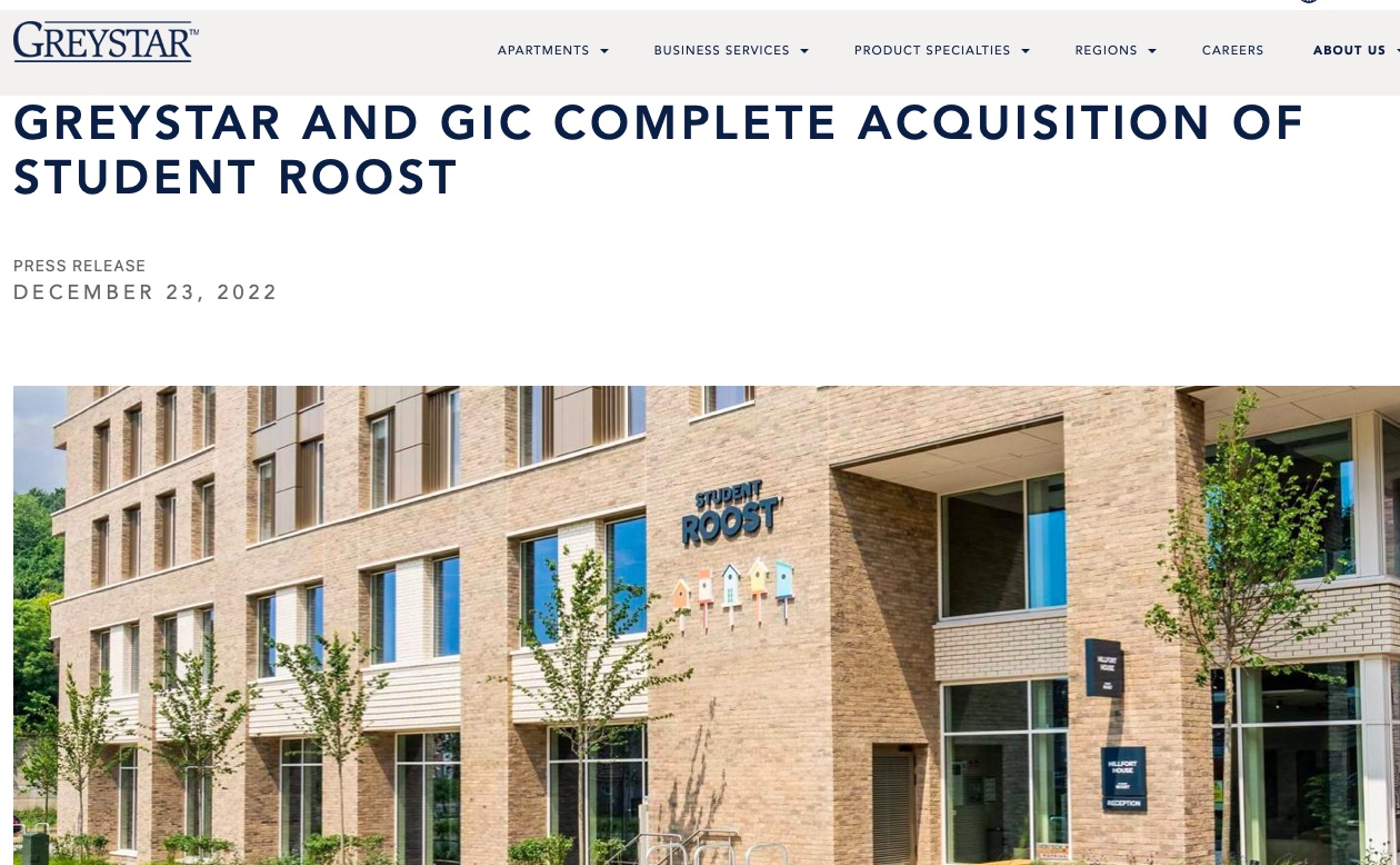 去年,GIC and Greystar 以 33 亿英镑从 Brookfield 手中收购了 Student Roost学生宿舍投资组合。