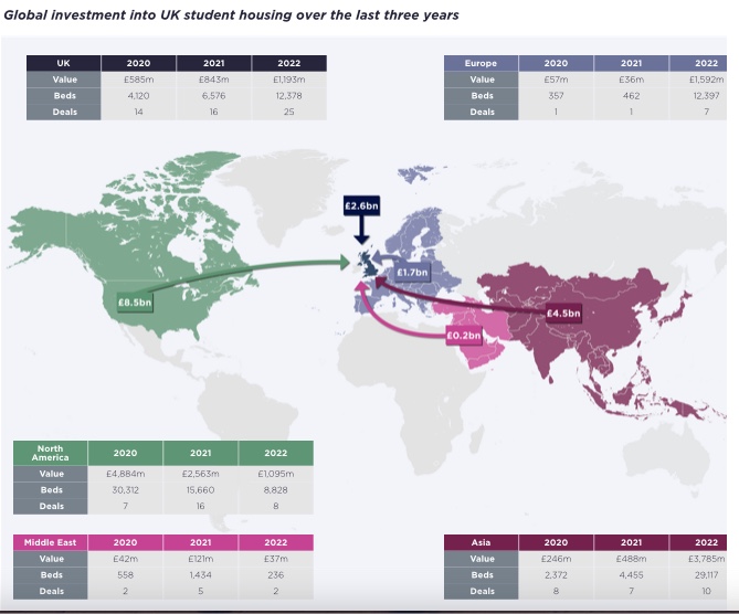 过去3年,英国投资学生公寓的资金有82%来自海外。最活跃的海外投资人来自美国和新加坡,占比47%和24%。