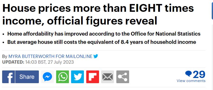 英国国家统计局(ONS)表示,截至2022年的财政年度,英格兰平均房价为27.5万英镑,而家庭年均可支配收入为3.3万英镑。这意味着平均一套房子的花费相当于家庭8.4年的收入。