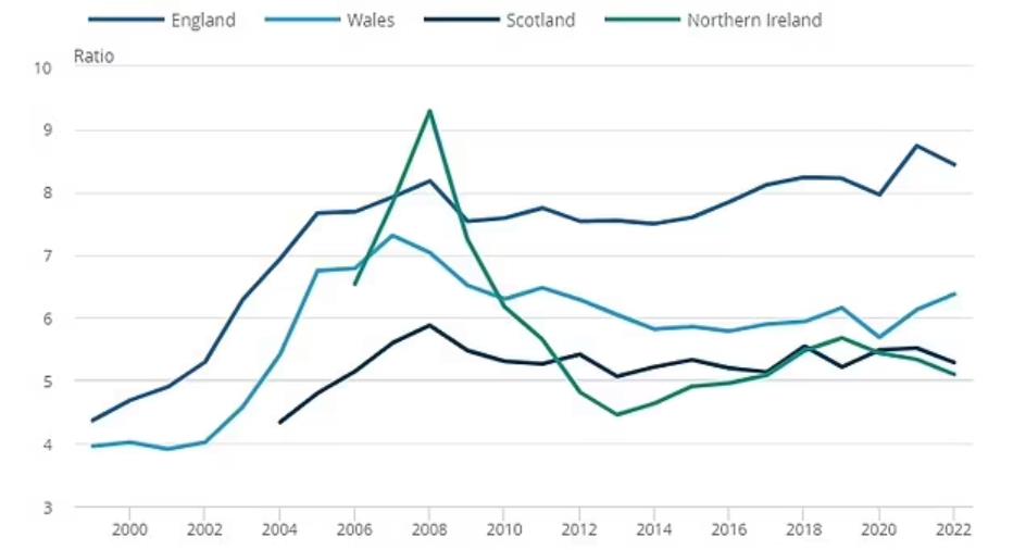 ONS表示,平均而言,自2017年以来,英国所有四个地区的房屋售价均超过五年家庭平均收入。