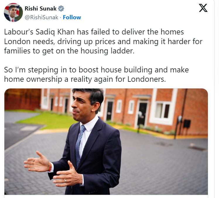 苏纳克表示:“伦敦市长未能交付伦敦需要的房屋。这推高了房价,让家庭更难登上住房阶梯,这就是为什么我们今天要介入,推动房屋建设,让人们再次拥有住房。”