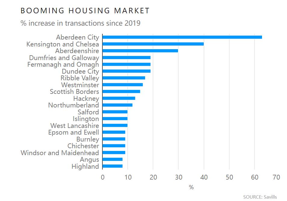 比如,在伦敦的富人区肯辛顿和切尔西(Kensington & Chelsea),今年的交易水平就比2019年增长了40%,而威斯敏斯特(Westminster)、哈克尼(Hackney)和伊斯灵顿(Islington)的交易量也较疫情之间有所增长。