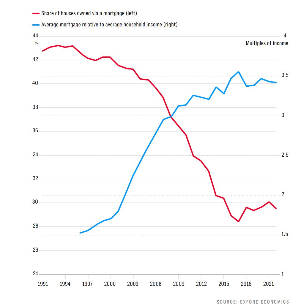 来自牛津经济研究院(OXFORD ECONOMICS)的研究显示,相比于20年前,英国的抵押贷款市场其实已大幅萎缩。在2000年,英国住房调查显示全国有42%的家庭持有抵押贷款。但现在,这一份额已降至不到30%。