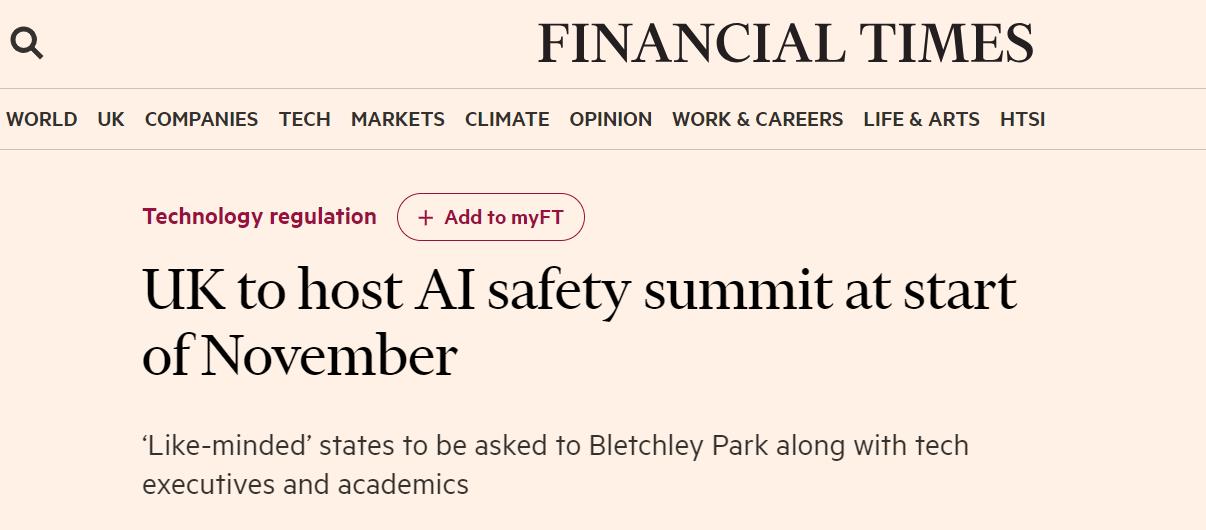 - 据报道,英国将于11月初举办人工智能安全峰会,以讨论人工智能带来的安全风险…