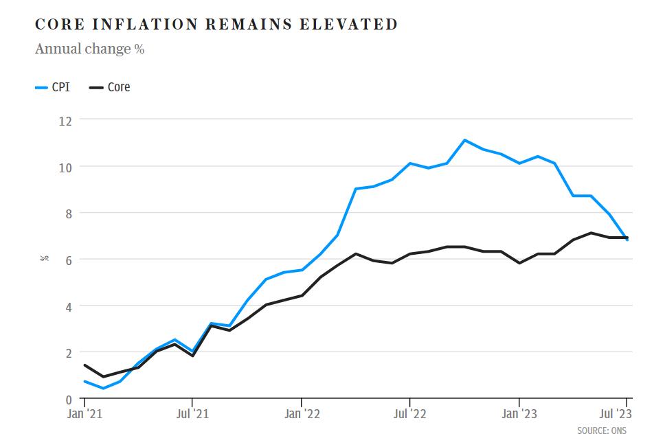 根据英国国家统计局 (ONS) 的数据,截至7月份的一年中,英国通胀率(消费者价格指数,CPI)上涨了6.8%,低于6月份的7.9%,也是自2022年2月以来的最低水平。