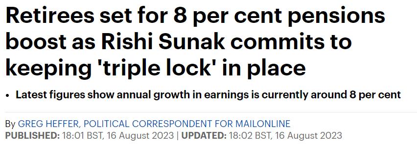 - 英国首相苏纳克承诺将保持养老金的“三重锁定”,这意味着退休人员的养老金将增加8%…