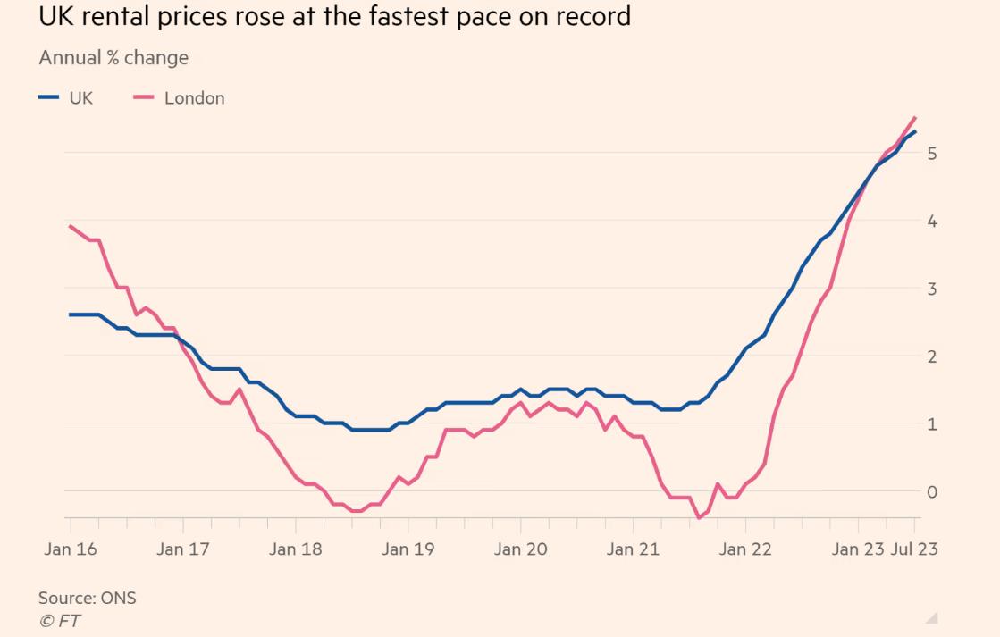 英国国家统计局(ONS)的数据显示,在截至7月份的一年里,伦敦私人租金上涨了5.5%,为近17年来的最高增速。