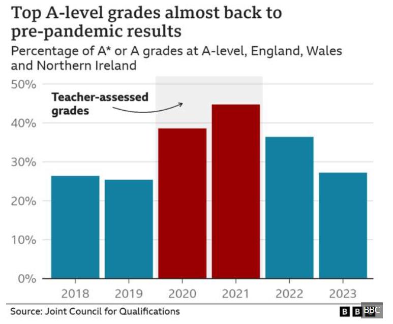 众所周知,在2019年新冠疫情爆发后,英国连续两年取消了A-level等大型考试,学生的成绩主要基于教师的评估得出,这也导致疫情期间,英国的高分比例大增,分数膨胀严重。