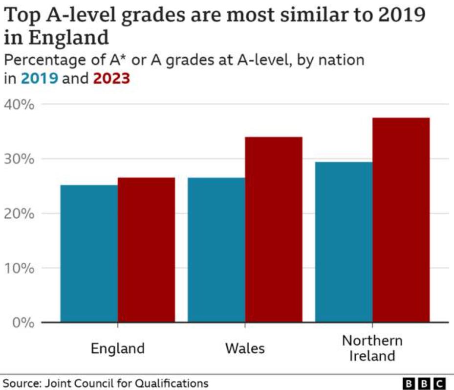 这意味,英格兰今年的高分比例比2019年高出约1.3个百分点。而在威尔士和北爱尔兰,这一比例高出约七到八个百分点。威尔士和北爱尔兰的考试监管机构表示,他们不打算在2024年之前恢复到疫情前的评分标准。