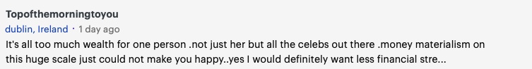 对一个人来说,财富太多了。不仅是她,还有所有的名人。金钱至上主义的规模如此之大,并不能让你快乐。是的,我当然希望减轻经济压力,但我绝对不想要所有这些……