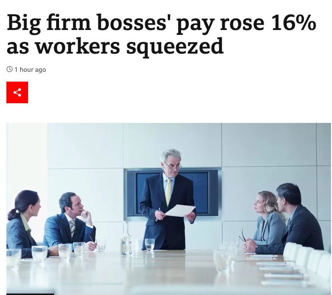 去年,由于物价上涨,大多数工人的工资受到挤压,英国大公司的总裁们的工资却平均上涨了近16%。