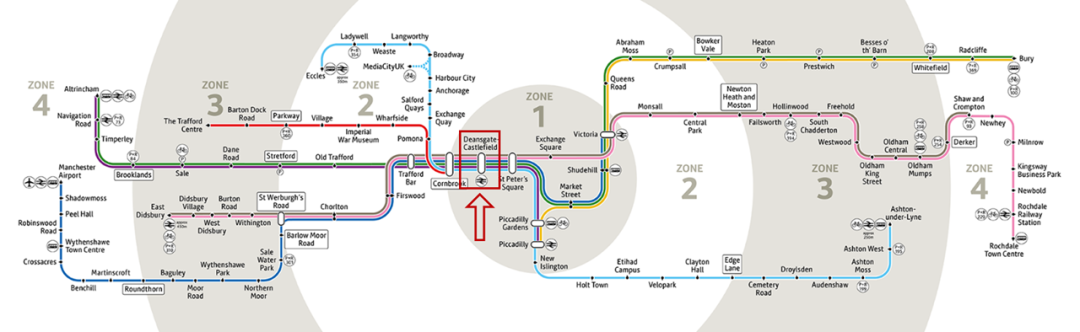 - 距离丁斯盖特轻轨站仅300米,该轻轨站是曼城最重要的换乘站,曼城的所有8条线路中,6条在此经过