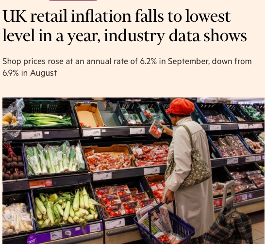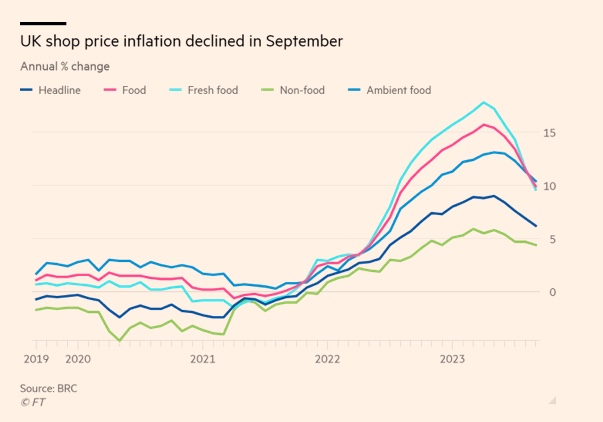 与此同时,9月份食品价格同比涨幅降至9.9%,在连续5个月下跌后,自去年8月以来首次触及个位数,低于4月份15.7%的历史峰值。8月至9月食品价格下跌0.1%,为两年多来首次环比下跌,该行业机构将此归因于“零售商之间的激烈竞争”。
