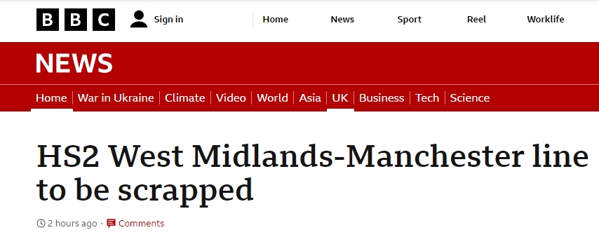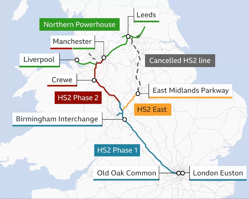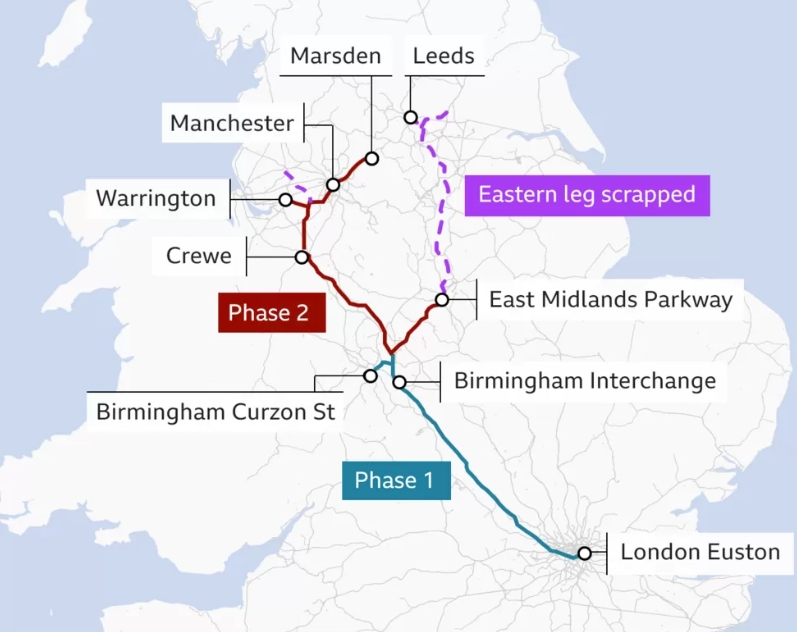 上文曾提到,在今天的保守党大会中,英国首相里希·苏纳克宣布,将取消从西米德兰兹(West Midlands)到曼彻斯特(Manchester)的HS2高铁线路,并将现金转移到其他交通项目。