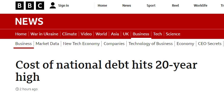 - 据报道,英国政府支付的国债利息已达到20年来的最高水平,目前30年期国债利率升至5.05%…
