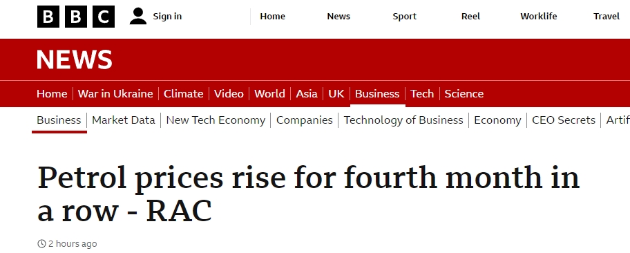 - 英国皇家汽车俱乐部(RAC)表示,汽油价格已经连续四个月上涨,上个月平均每升上涨4.5便士…