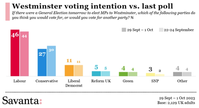 而据Savanta的最新调查,工党在民调中依旧遥遥领先,支持率为46%,比上次民调时还增加了2个百分点。相比之下,保守党的支持率下降了3个百分点,为27%。
