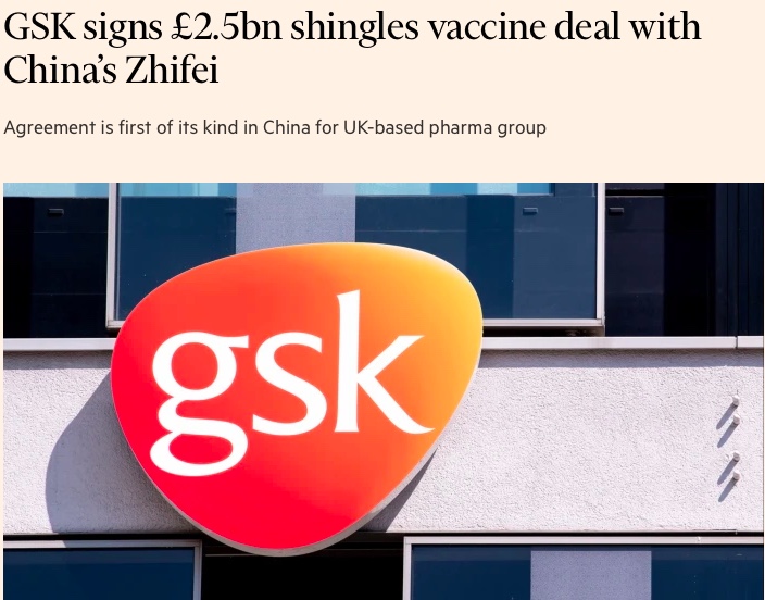 - 据金融时报报道,葛兰素史克与中国按收入计最大疫苗公司智飞签署25亿英镑协议。智飞将在3年内购买25亿英镑葛兰素史克的畅销Shingrix带状疱疹疫苗,这是葛兰素史克在中国的首次这类合作。