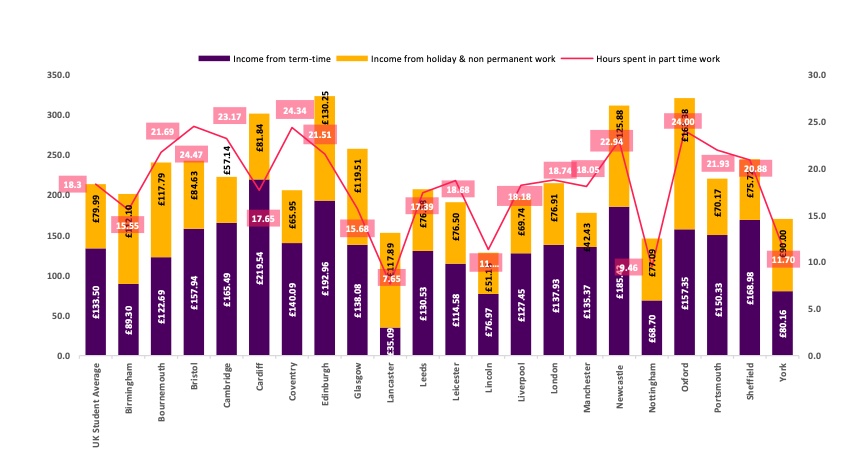 - 牛津、爱丁堡和纽卡斯尔的学生最有可能将假期工作收入作为他们在大学期间的一部分支出。