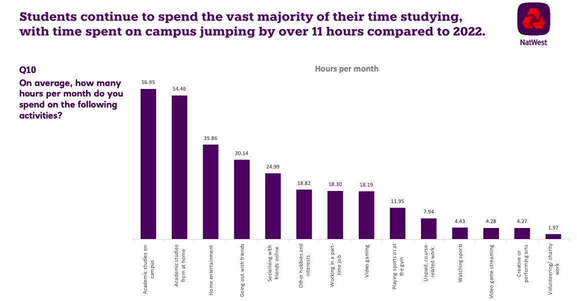 - 学生使用流媒体服务的时间更多,平均为35.86小时,而2022年为16.5小时。这意味着流媒体服务已经超过了与朋友外出的时间(30.14小时)。自2022年以来,花在社交和爱好上的钱急剧减少。学生们现在每月在这些活动上分别花费52.55英镑和30.54英镑。与2022年的每月70英镑和92英镑相比,这是一个显著的削减。