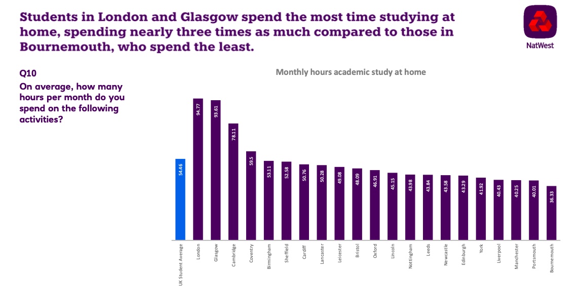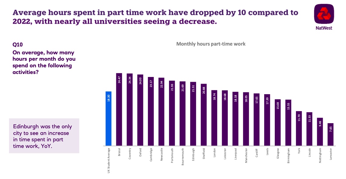 - 布里斯托尔、考文垂和朴茨茅斯的学生每月花在兼职工作上的时间最多,这些大学的学生平均每月超过24小时。