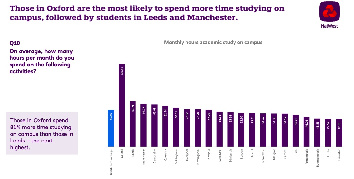 - 虽然牛津大学的学生在校学习时间最多,但伦敦、格拉斯哥和剑桥大学的学生在家学习时间最多。