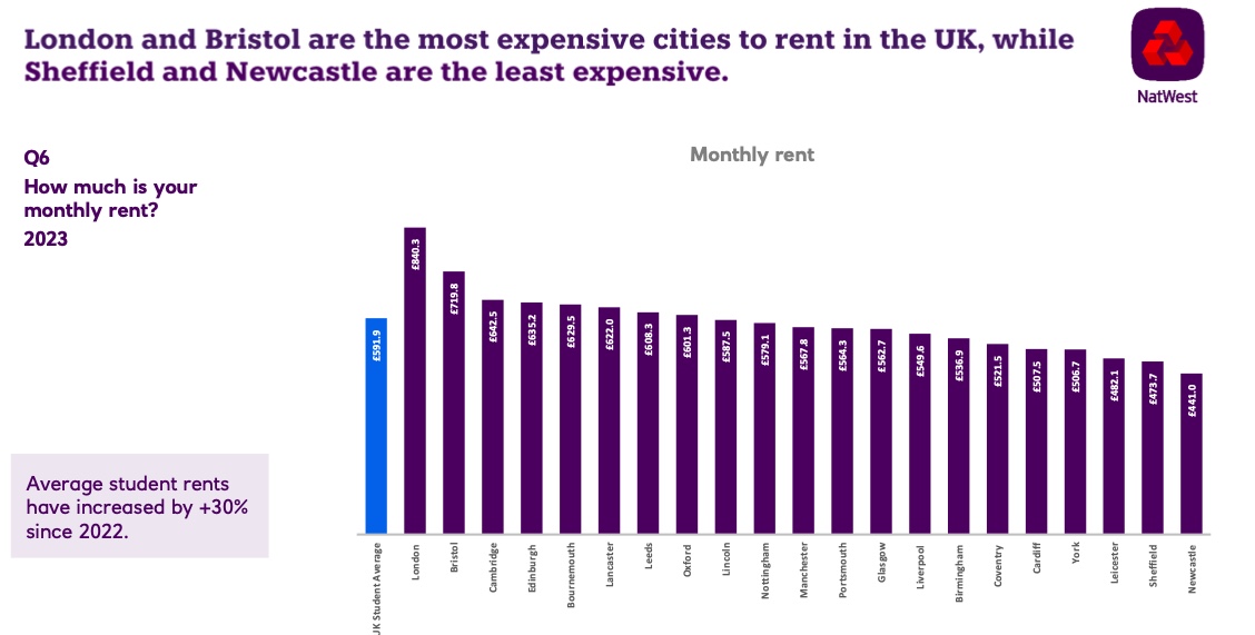 - 在英国租房成本最高的是伦敦和布里斯托。自2022年以来学生租金平均上涨了30%。