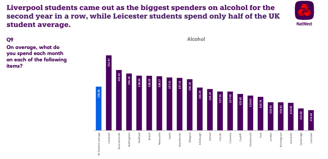 - 利物浦的大学生仍然是最大的酒精消费群体,每月花费约52.97英镑,比英国平均水平高出71%。