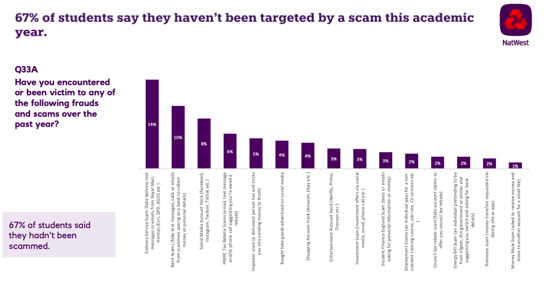 - 33%的学生表示,他们在过去一年中遭遇或成为欺诈或骗局的受害者,低于2022年的47%。