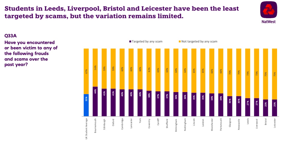 - 利兹、利物浦、布里斯托尔和莱斯特的学生在2023年遭遇的诈骗尝试最少。爱丁堡的学生是第二大目标,仅次于伯恩茅斯的学生。