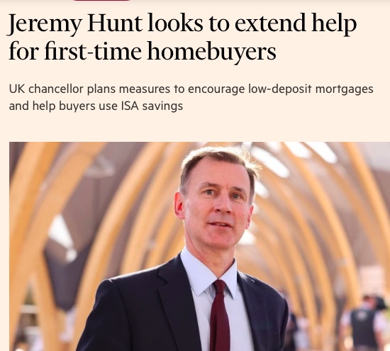 - 英国财政大臣杰里米·亨特计划采取措施,鼓励低首付抵押贷款,或将帮助首次购房者使用ISA储蓄,享受补贴购房。