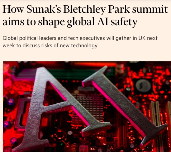 - 据金融时报报道,全球政治领袖和科技高管下周将齐聚英国,参加Bletchley Park 峰会,讨论如何塑造全球人工智能安全。