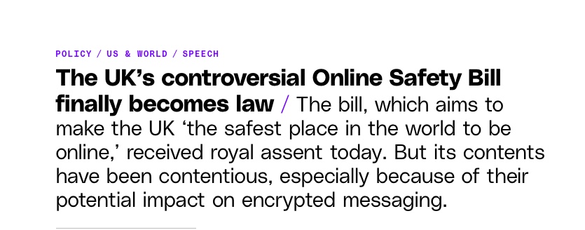 - 据英国媒体报道,《在线安全法案》(Online Safety Bill)已获批正式成为法律。