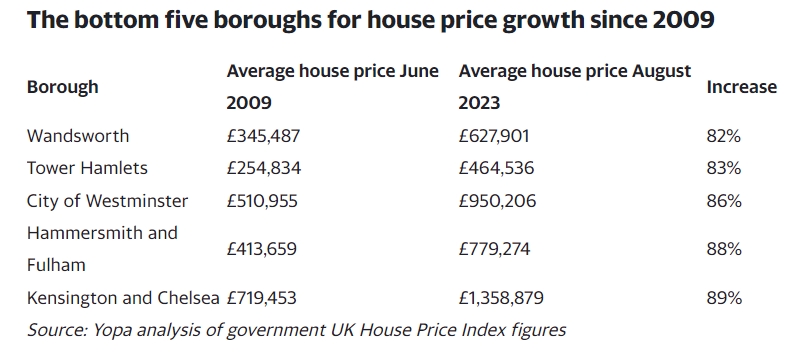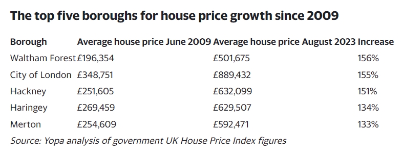 据Yopa的最新研究,自2009年金融危机以来,在过去的14年里,伦敦几乎每个行政区的平均房价都翻了一番。