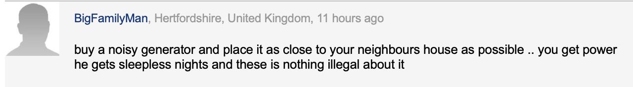 买一个噪音大的发电机,并把它放在离你邻居房子尽可能近的地方。你有权力这样做,他会彻夜难眠,这并不违法……