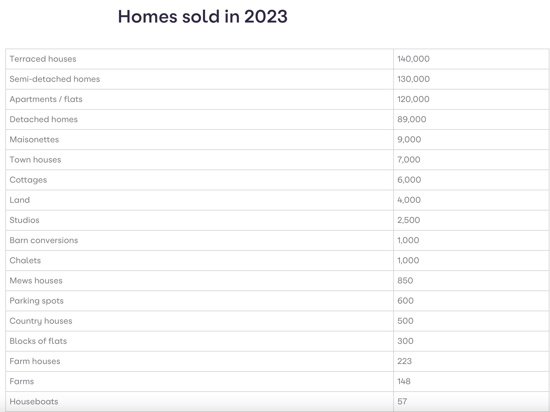 - Zoopla的数据显示:2023年最畅销的房产类型为联排房。