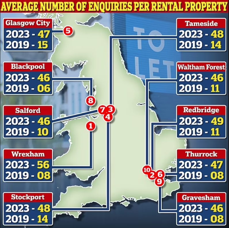 据Rightmove报道,过去一年,英国每处出租房产收到的潜在租户的咨询数量增加了两倍多,从2019年的每处房产6起增加到2023年每处房产20起。