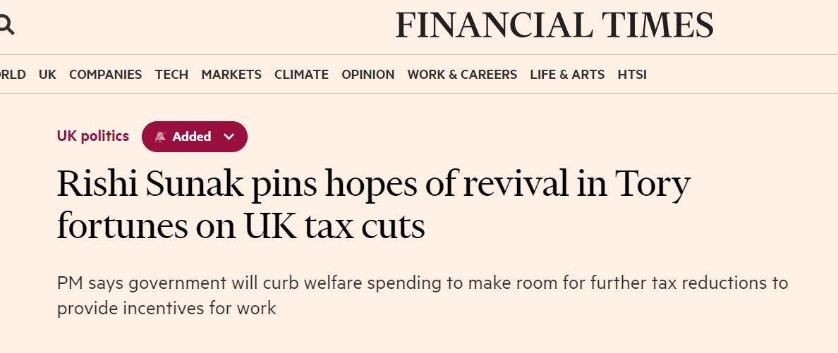 苏纳克表示,保守党将把重点放在削减“工作”的税收上,并通过缩减政府开支来筹集资金,包括限制福利支出等。