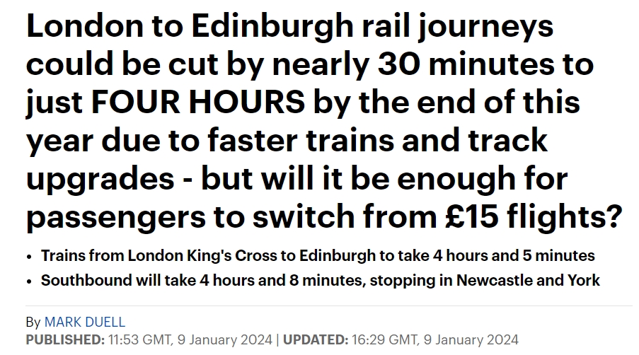 相比之下,目前伦敦至爱丁堡的平均运行时间为4小时30分钟,部分特快列车大约需要4小时20分钟。