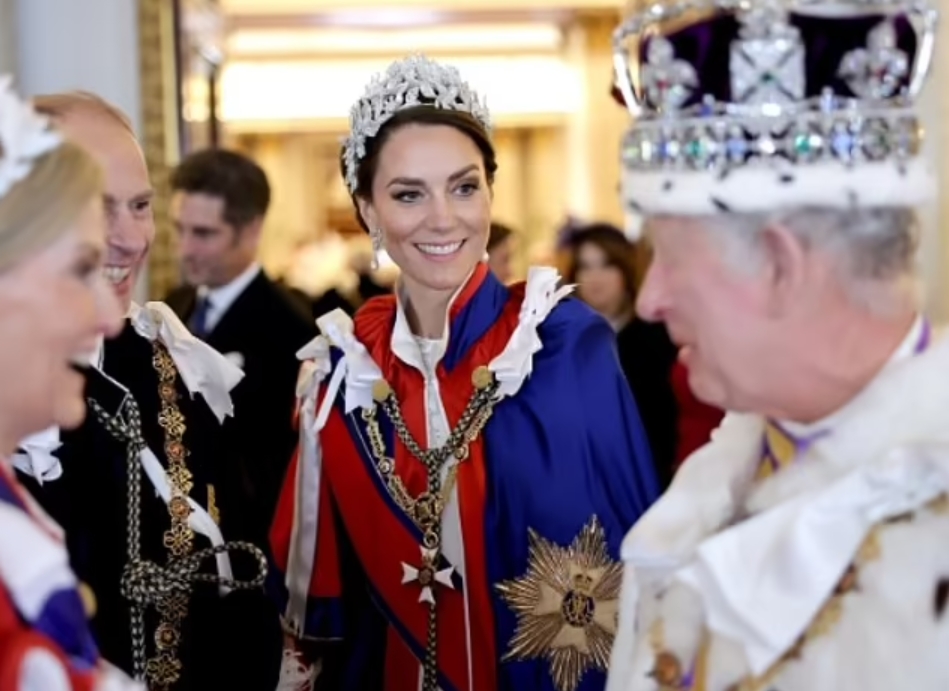 照片中,凯特与爱德华王子和爱丁堡公爵夫人索菲站在一起,看着她的岳父查尔斯国王。